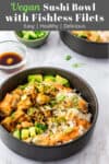 - Assemble the sushi bowl. Place the seasoned sushi rice in a bowl, about 1 and ½ cups. Add the diced cucumber, vegan fishless filets, and avocado. Drizzle with vegan spicy mayo sauce. Garnish with green onion.